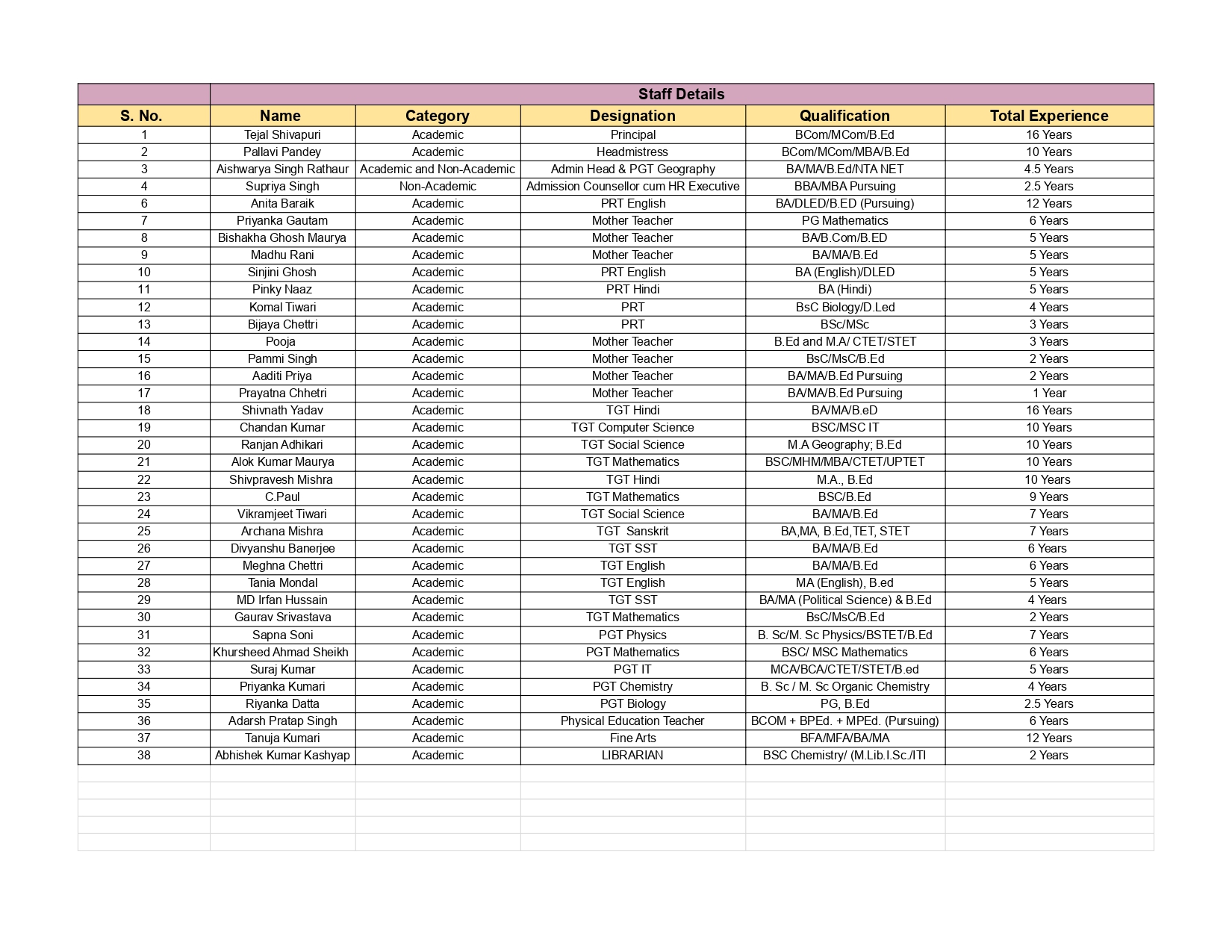 | 1 | PRINCIPAL | 1 | Tejal Shivapuri, B.Ed, M.Com |